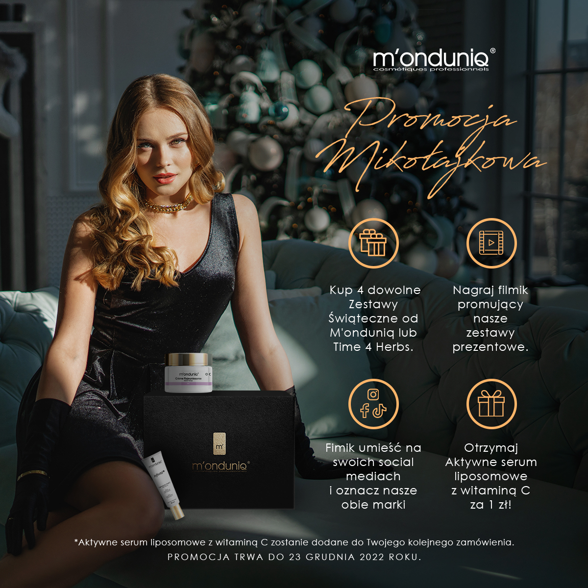 Mamy świetną wiadomość dla wszystkich gabinetów współpracujących z naszą marką, które zdecydowały się na zakup Zestawów Świątecznych od M'onduniq i Time 4 Herbs! Wystarczy zakupić 4 dowolne zestawy prezentowe, by wziąć udział w naszej specjalnej Promocji Mikołajkowej. A co należy zrobić jeszcze by otrzymać Aktywne serum liposomowe z witaminą C? Wystarczy spełnić zaledwie 3 kroki: