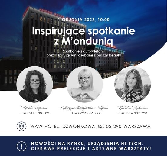1 grudnia zapraszamy na "Inspirujące spotkanie z M'onduniq", które odbędzie się w Warszawie w WAW Hotel. Jest to kolejne nasze wydarzenie organizowane w ramach niezwykłego cyklu spotkań. Podczas których nasi goście mogą zarówno poszerzać swoją wiedzę związaną z aparaturą i zabiegami beauty, jak również otrzymać zastrzyk pozytywnej energii oraz móc spojrzeć na swój zawód rozwojowo. Na prelekcjach prowadzonych przez naszych szkoleniowców oraz zaproszonych gości, będących autorytetami w swoich dziedzinach dowiesz się miedzy innymi: