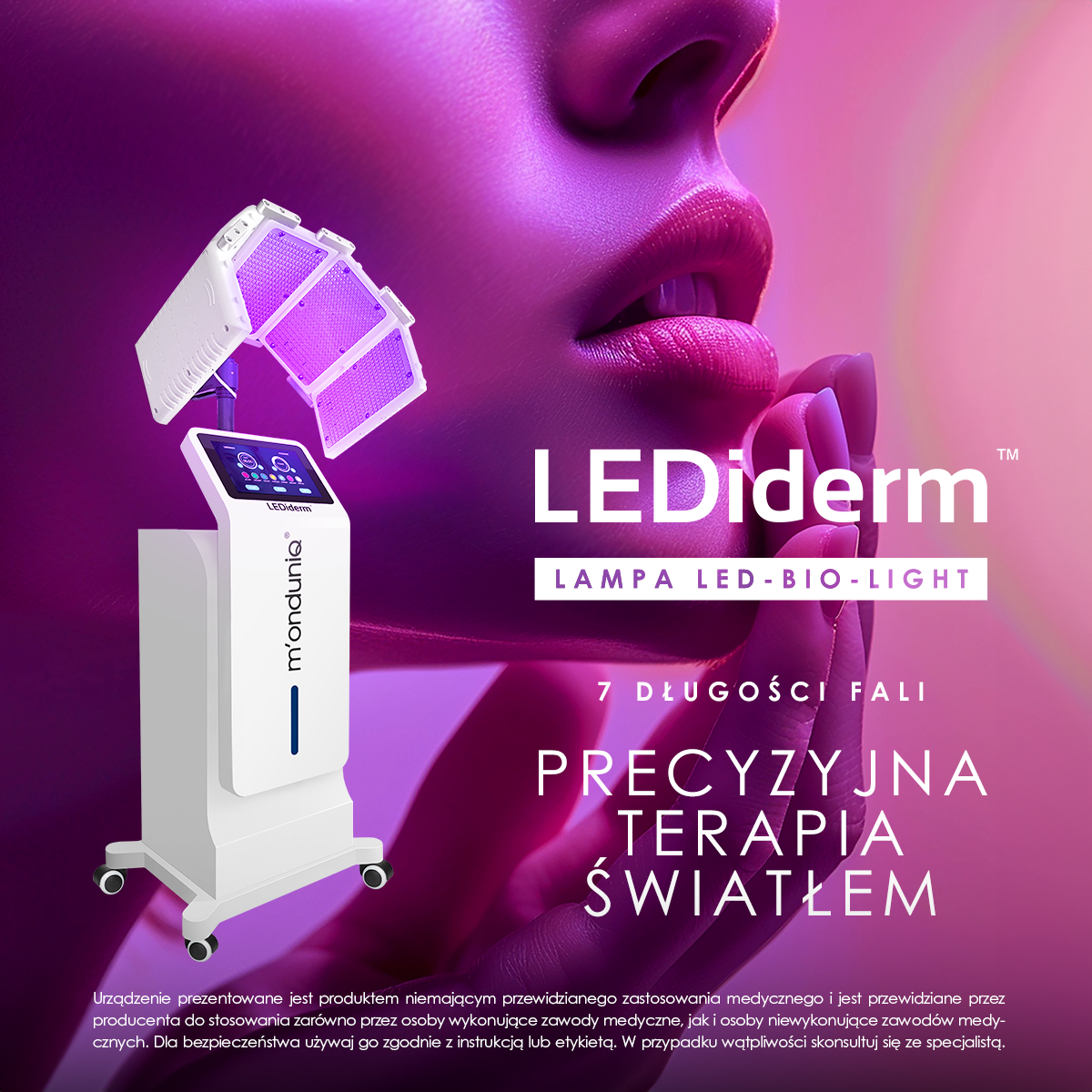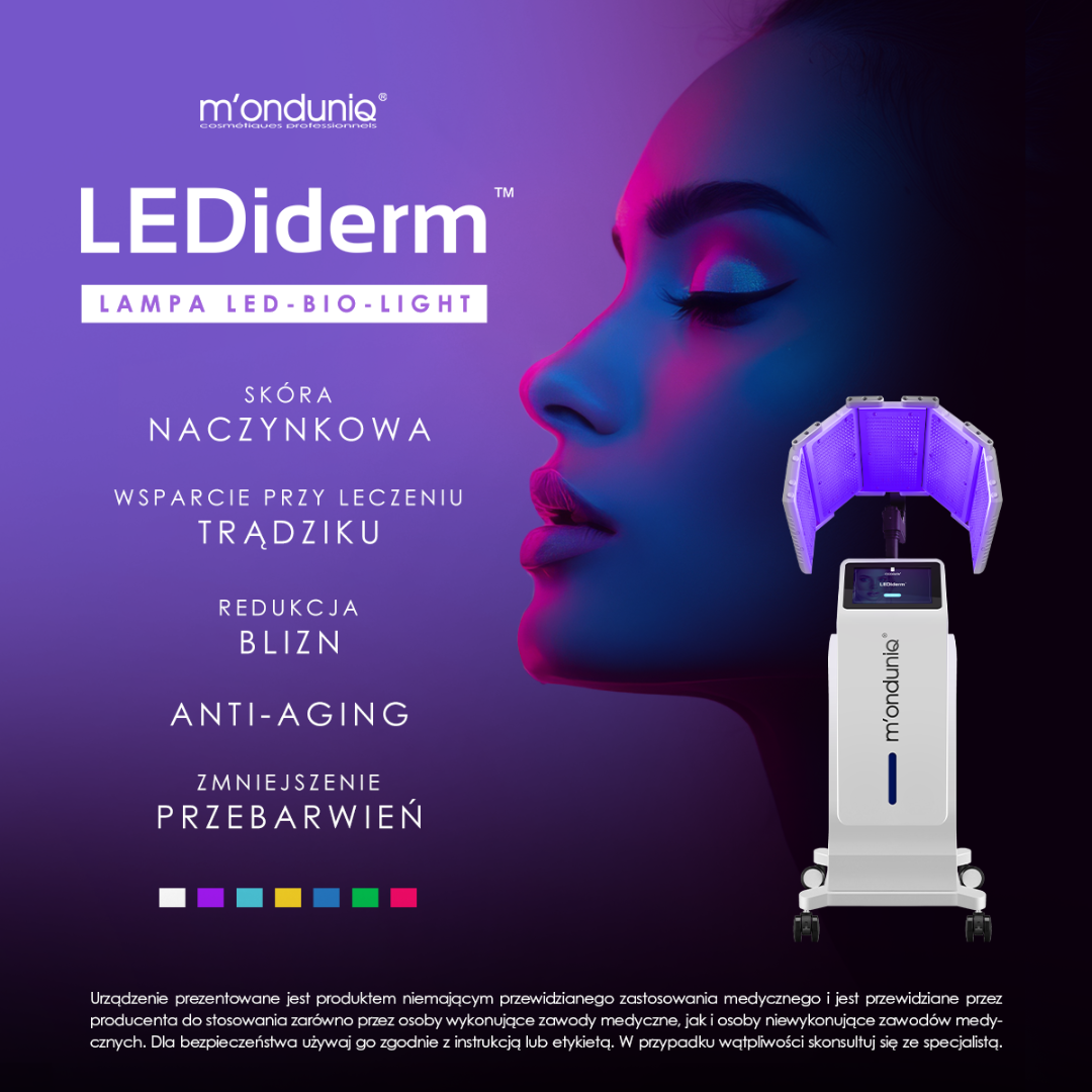 W naszej ofercie pojawiła się nowość - specjalistyczna lampa LEDiderm Led-Bio-Light, która jest idealnym uzupełnieniem zarówno procedur stosowanych w trakcie zabiegów w gabinecie, jak i we wszelkich programach pozabiegowych. Odpowiednio zastosowana procedura świetlna może wspomagać i przyspieszać powrót klienta do normalnego i komfortowego funkcjonowania. Takie zastosowanie może sprawdzić się po zabiegach z użyciem laserów, mezoterapiach igłowych, radiofrekwencji mikroigłowej, peelingach chemicznych, niciach, zabiegach chirurgicznych, zabiegach oczyszczających czy odchudzających itp.